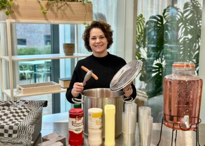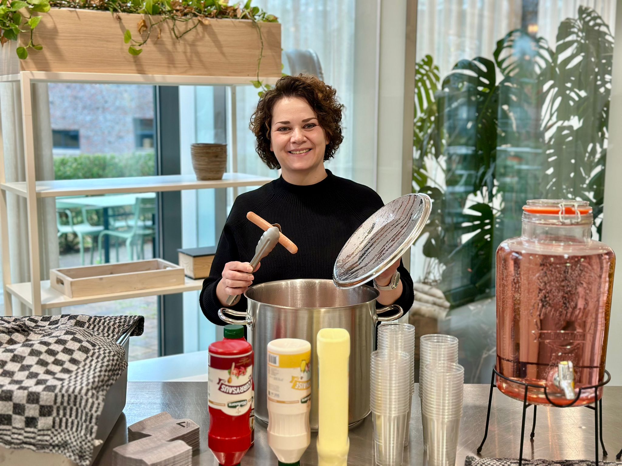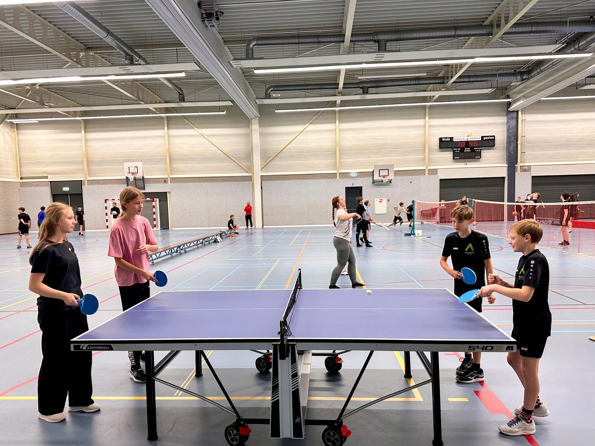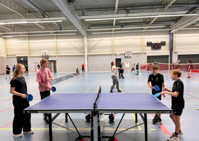 Angekommen am Almende College wurden die deutschen Schülerinnen und Schüler herzlich von ihren niederländischen Freunden begrüßt und in die Mensa begleitet. Dort wurde das anstehende Tagesprogramm besprochen und es wurde zusammen einige Warm Up-Spiele gespielt, bevor nach einer kleinen Pause ein buntes Sportprogramm anstand: An verschiedenen Stationen konnten sie gemeinsam Hockey spielen, Trampolin springen, schaukeln sowie Tischtennis und Fußball spielen. Nach so viel Sport waren alle sehr hungrig. Glücklicherweise hatten unsere niederländischen Gastgeber auch an die Versorgung aller Teilnehmerinnen und Teilnehmer gedacht. In dem modern eingerichteten Café der Schule wurde eine echte kulinarische Delikatesse aus Schülerperspektive serviert: Hot Dogs mit viel Ketchup und Mayonnaise! Was will man mehr? Nachdem sich alle gestärkt hatten, ging es für die Schülerinnen und Schüler wieder an die “Arbeit“: Aufgeteilt in Gruppen mussten sie bekannte deutsche und niederländische Lieder in die richtige chronologische Reihenfolge ihrer Entstehungszeit setzen, ihren deutsch-niederländischen Wortschatz beim Memoryspielen erweitern und ihre geografischen Kenntnisse aufpolieren.