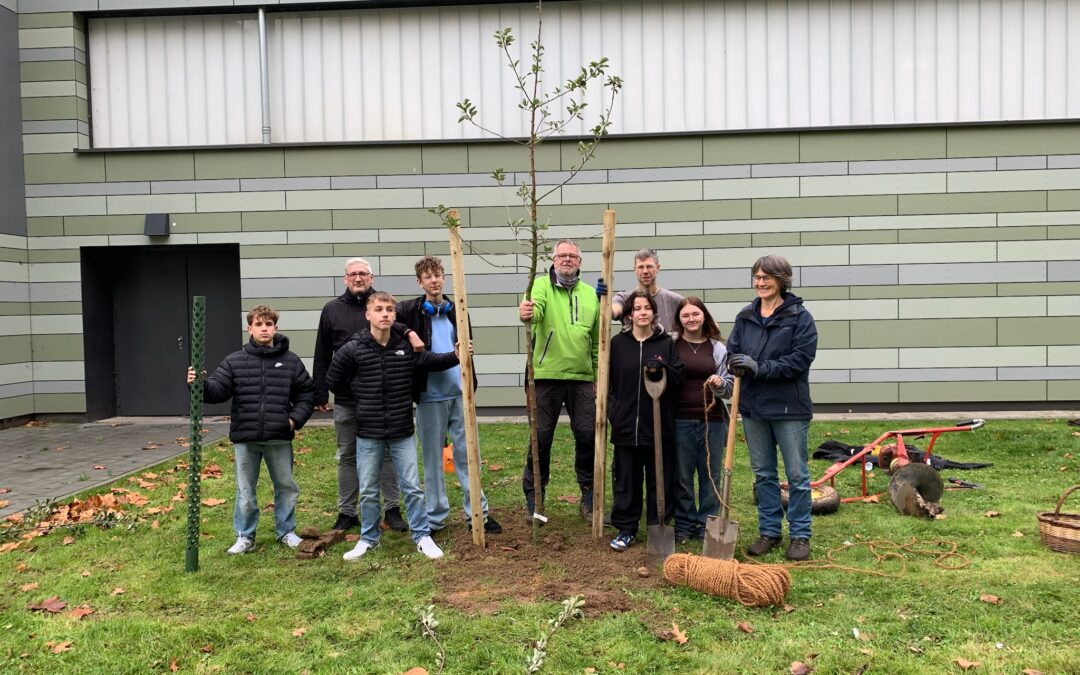 Am 29.10.2025 hat sich die Gesamtschule am Forstgarten – nominiert von der Sparkasse Rhein-Maas – an der regionalen Baumpflanz-Challenge beteiligt. Vor der Turnhalle (Richtung Hohe Straße) setzten SuS der Berufsorientierung (BO) „Garten“ fünf Apfelbäume der Sorten Alkmene, Gravensteiner, Kaiser Wilhelm, Goldparmäne und Boskop.