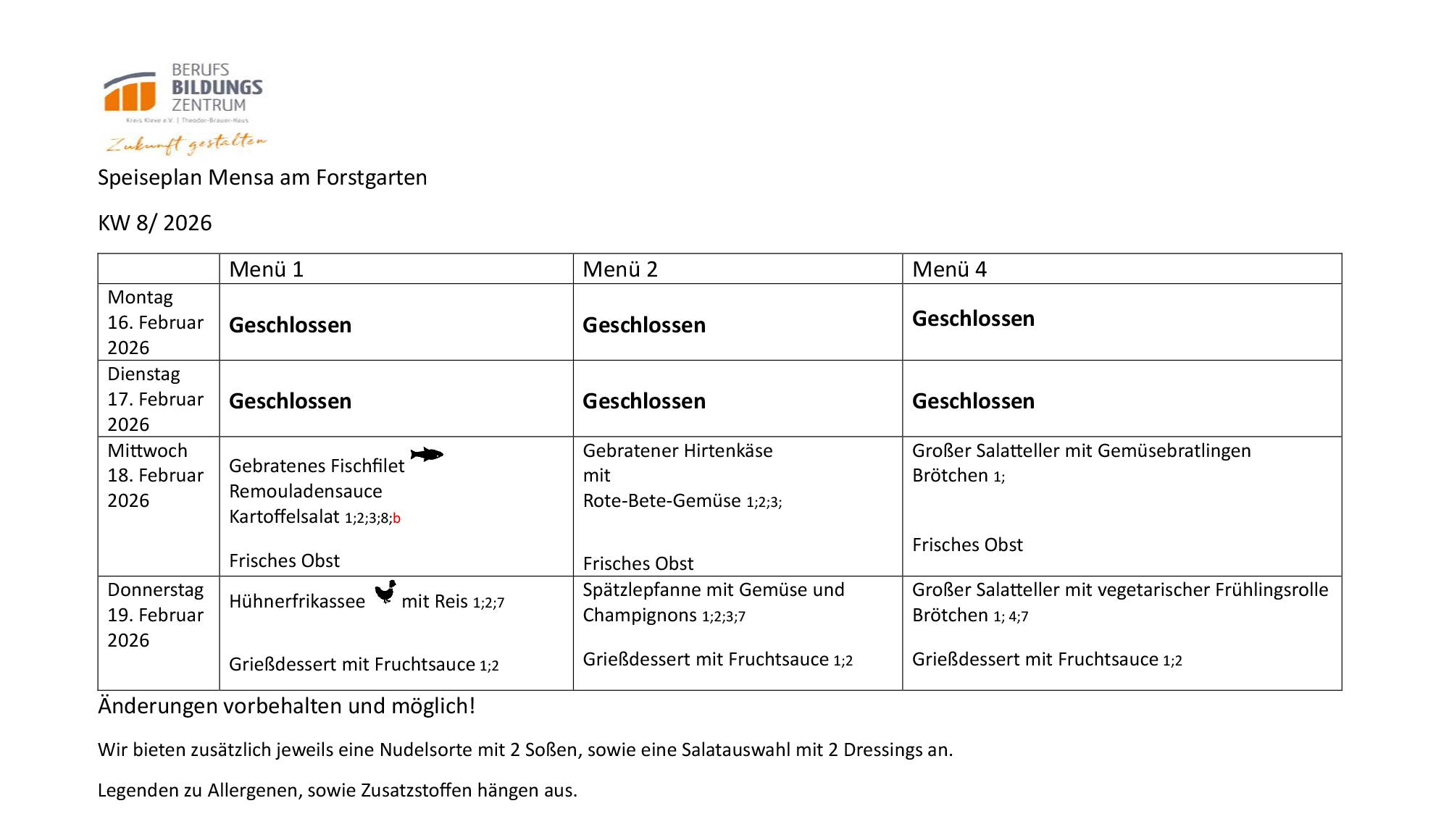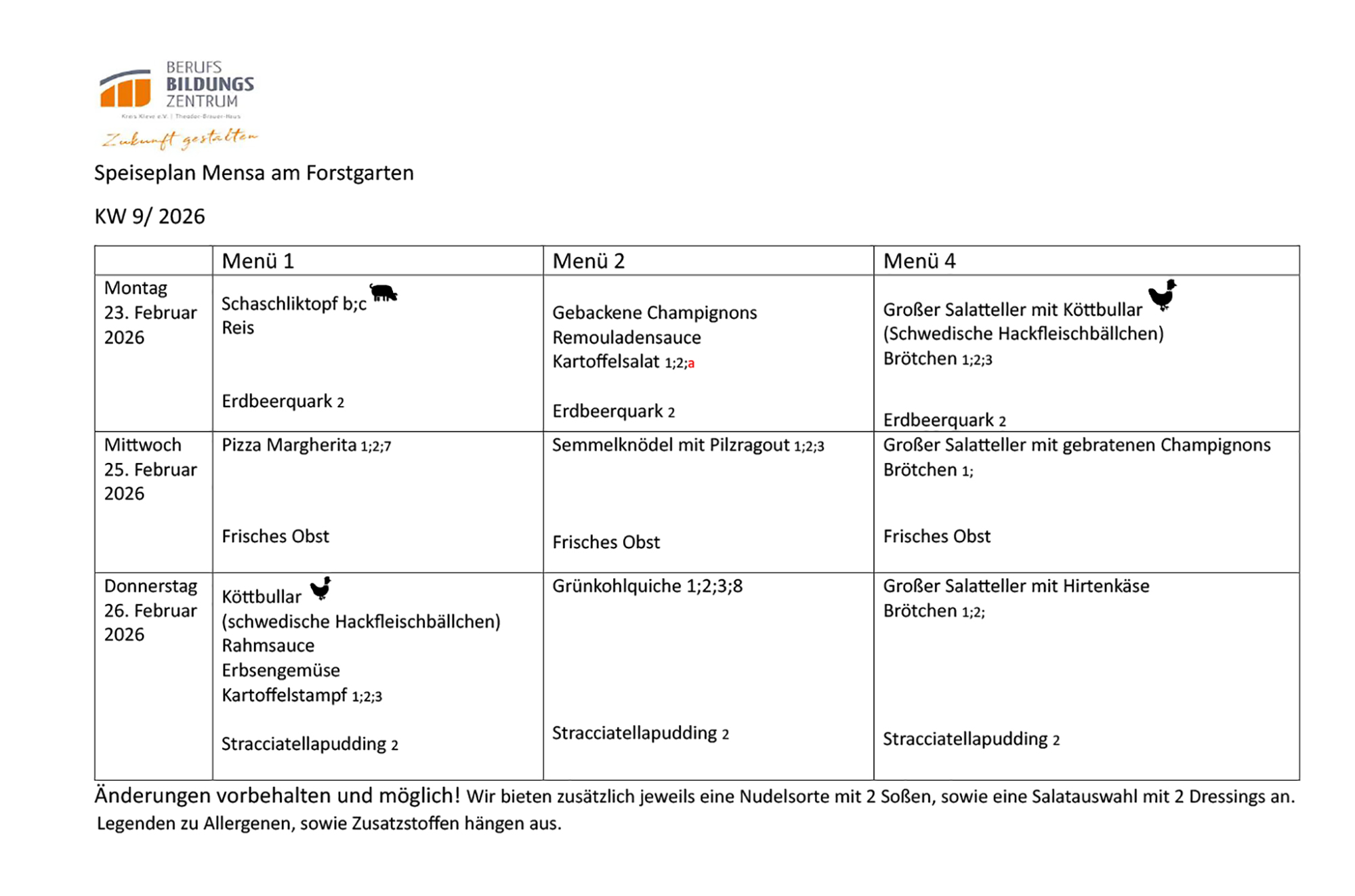 - Die Bestellfrist für die Mittagsmenüs beträgt 3 Werktage, d. h. nach Ablauf dieser Frist ist eine Bestellung nicht mehr möglich; jedoch besteht für sie Schüler:innen die Möglichkeit, spontan am Tag selbst ein Essen in der Mensa gegen Guthabenabbuchung vom Chip zu erwerben.